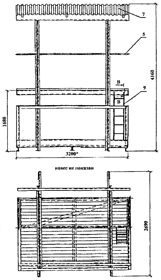 настил; 4 - щит; 5 - ограждение; 6 - сетка; 7 - навес; 8 - петля; 9 - лестница