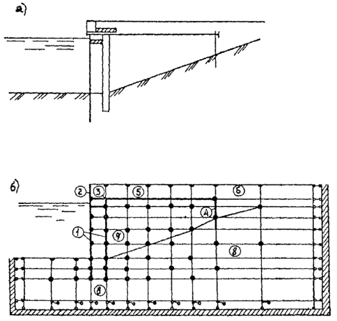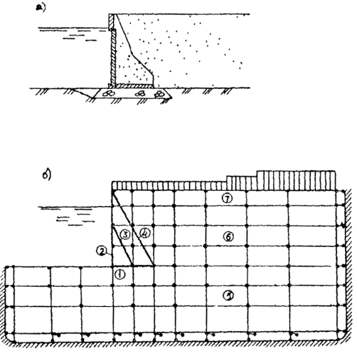 11. Динамическая расчетная схема подпричального откоса набережной а - поперечный разрез причала; б - расчетная схема МКЭ для расчетов