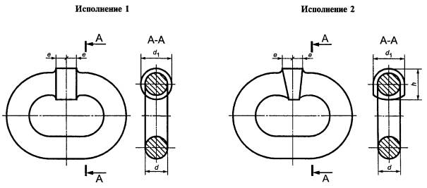 цепь d - калибр; d1 - диаметр материала, измеренный в месте сварки; h - толщина звена в месте сварки; е - длина сварного шва в каждую сторону от середины звена Рисунок 2 - Звено цепи Таблица 1
