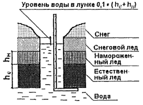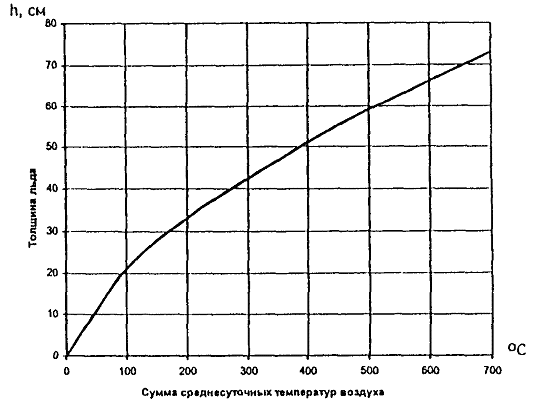 4.8. Наморожение льда снизу рекомендуется при устойчивых среднесуточных температурах воздуха ниже -15°С. По прочности намороженный снизу лед приравнивается к прочности прозрачного льда. 4.8.1. При намораживании снизу поверхность льда очищают от снега на ширину 30 - 40 м. Время для намораживания льда до требуемой толщины может быть определено по формуле