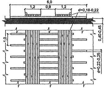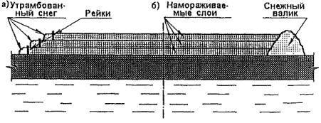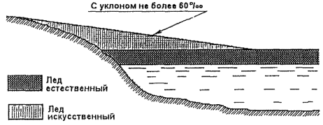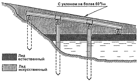 Рис. 4.5. График нарастания толщины пресноводного льда, очищенного от снега, на водоемах без течения. 4.10. На ледовых переправах необходимо устанавливать дорожные знаки, показывающие установленную на данный день грузоподъемность ледяного покрова, скорость движения автомобилей, интервал между ними, часы разрешенного проезда по переправе, заблаговременную предупредительную надпись о переправе. Все знаки должны устанавливаться в соответствии с рекомендациями разд. 8 и требованиями действующих нормативных документов по установке дорожных знаков, схема расстановки знаков и организации движения на переправе должна быть согласована с областным (территориальным) ГИБДД: Рис 4.6. Усиление ледяного покрова деревянным колейным настилом. 4.11. Для обогрева обслуживающего переправу персонала, шоферов и пассажиров должны быть организованы у въездов на переправу стационарные, а при необходимости и передвижные пункты обогрева с запасом воды для людей и для заправки двигателей транспортных средств, обслуживающих переправу. 4.12. По обеим сторонам переправы на расстоянии 0,5 м от обочин должны стоять хорошо заметные ограничительные вешки с интервалом между ними 15 - 20 м. При возможности их следует покрывать светоотражающей пленкой. 4.13. Переправы должны быть оборудованы средствами связи (радио, телефон и т.д.) между контрольно-пропускными пунктами на берегах, службой наблюдения за переправой. 5. СТРОИТЕЛЬСТВО ПЕРЕПРАВ5.1. После окончания разработки и утверждения проекта ледовой переправы издается приказ о ее строительстве, в котором необходимо указать руководителя строительства, перечислить состав бригад или звеньев, приданной им техники, основные сроки выполнения работ в соответствии с разделом организации строительства проекта переправы, порядок финансирования работ и премирования персонала за отличное выполнение, порядок проверки знаний по технике безопасности, состав комиссии по приемке переправы в эксплуатацию и порядок приемки. Основные проектные характеристики переправы заносятся в паспорт ледовой переправы (прил. 6). 5.2. Строительство ледовой переправы целесообразно осуществлять в два этапа: ¨ на первом этапе - летом - необходимо выполнить весь объем подготовительных работ по подготовке инженерного оборудования переправы, дорожных знаков, необходимой техники и материалов, а также по возможности выполнить все строительные работы на подходах к переправе; ¨ на втором этапе - после ледостава и наступления устойчивых морозов - следует в возможно более короткие сроки выполнить все основные работы по строительству и обустройству переправы. 5.3. На первом этапе строительства ледовой переправы необходимо провести следующие работы: ¨ устройство подходов к переправе, включая основные и резервные полосы движения; ¨ устройство съездов к переправе; ¨ углубление, а в отдельных случаях и спрямление русла реки (на судоходных реках при условии согласования с Бассейновым управлением пути); ¨ подготовку механизмов для работы на ледяном покрове зимой; ¨ заготовку указательных знаков и ориентирующих вех; ¨ закрепление створа переправы; ¨ заготовку элементов конструкций сопряжения ледяного покрова с берегом. 5.4. Русло реки углубляют прежде всего на перекатах (для снижения скорости воды в реке и предотвращения образования крупных наледей). Дл