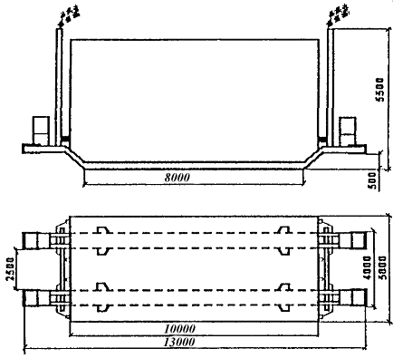 6.5. В качестве контрольного блока целесообразно применять набор железобетонных пригрузов постепенно увеличивающейся массы; можно взять ящик с песком переменной высоты, но лучше всего - цистерну с послойно намораживаемой в ней водой (рис. 6.1), можно также использовать послойно намораживаемый в переставной опалубке бунт льда и прочие тарируемые грузы. 6.6. Прогиб ледяного покрова измеряют с помощью нивелира, установленного на расстоянии 60 - 100 м от оси трассы (с использованием марок на льду и реперов на берегу). 6.7. В условиях полярной ночи вместо нивелира и теодолита следует освоить применение светового луча (исходящего от источника света). Рис. 6.1. Контрольный блок на термолыжах. 6.9. Контрольный блок по ледовой переправе при малых толщинах льда следует перемещать легким тягачом, а затем и более мощным. Взамен тягача можно использовать на одном берегу электролебедку и на другом - отводной ролик. 6.10. Для лучшего скольжения по льду контрольный блок целесообразно установить на термолыжи (рис. 6.2). 6.11. При использовании в качестве контрольного блока цистерны с водой в нее надо вставить объемный компенсатор (рис. 6.3) для предотвращения разрыва корпуса цистерны при быстром промерзании в ней воды. Рис. 6.2. Общий вид термолыжи: 1 - полозья; 2 - основная