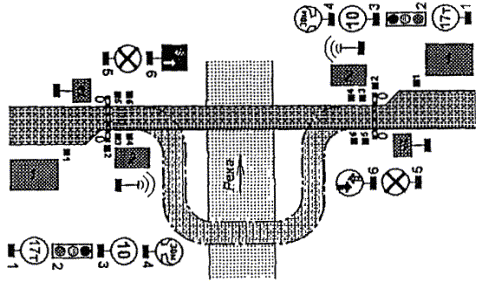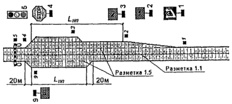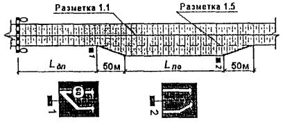 8.11.4. В зоне накопительной полосы следует предусматривать установку информационно-указательных знаков 5.8.3 "Начало полосы", 5.8.7 Направление движения по полосам" и 5.9 "Полоса для транспортных средств общего пользования". За 10 - 20 м до шлагбаума необходима установка знака 2.5 "Движение без остановок запрещено". В зоне посадочных полос следует устанавливать информационные плакаты с надписью "Место для посадки пассажиров" и "Место высадки пассажиров". Схема организации движения на подходе к переправе с накопительной и посадочной полосами приведена на рис 8.5. Рис. 8.5. Принципиальная схема организации движения на подходах к ледовой переправе в зонах накопительных и посадочных полос: 1 - транспарант "Левая