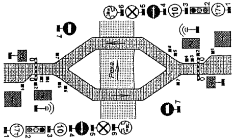 Рис. 8.3. Схема организации движения на ледовой переправе при двух раздельных полосах движения для каждого направления: 1 - помещение для ожидания и