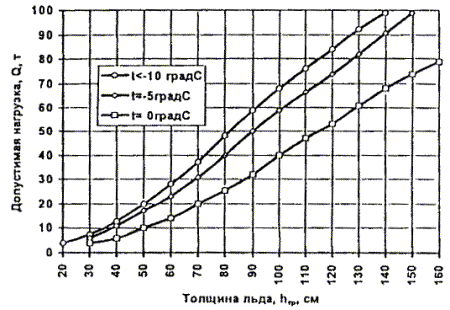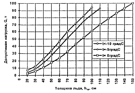 Рис. П.2.1. Допустимые нагрузки на ледяной покров при пропуске по нему гусеничных автомобилей Таблица П.2.2.