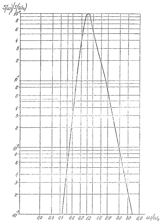 (м2с)/рад, w - текущая частота, рад/с; 4.1.5. Допускается при расчете частотного спектра ветровых волн использовать график рис. 4.1., причем S(w)/S(w0) определяют по безразмерной частоте w/w0, где S(w0) - спектральная плотность на частоте максимума, (м2с)/рад, w0 - частота максимума, рад/с. Спектральную плотность S(w0) и частоту максимума определяют по формулам: