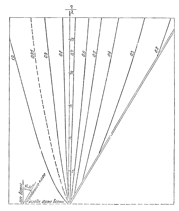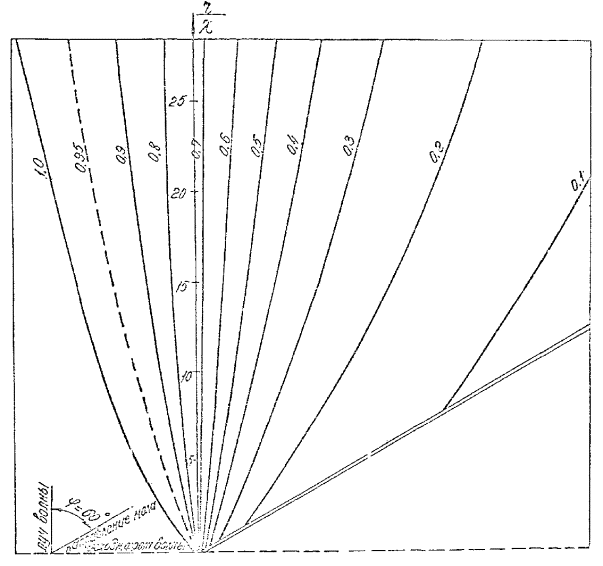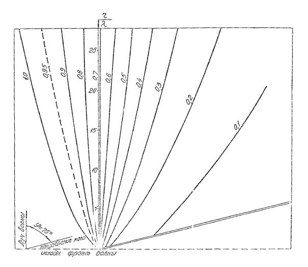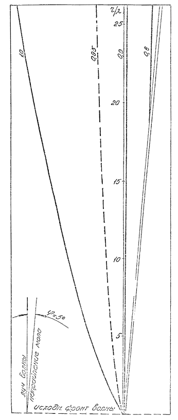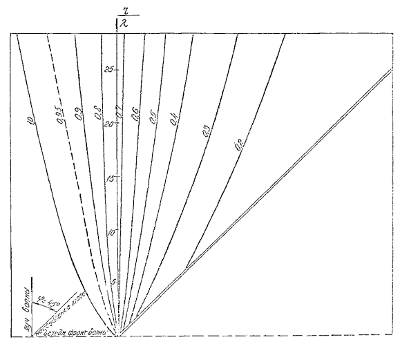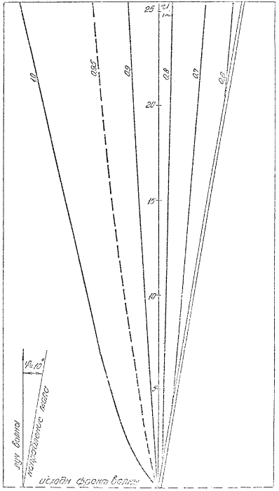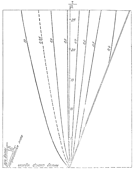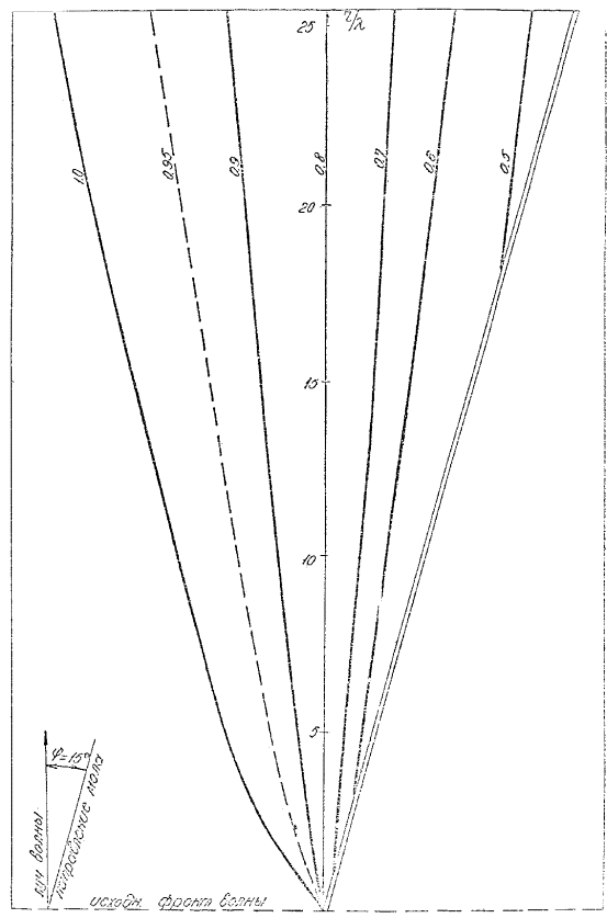 лучу исходной волны, называемых границами волновой тени молов. Этими лучами