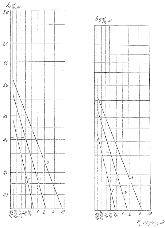 = 0,2 случ/год на рис. 4 в соответствии с формулой (4.7) отвечают h1% = 2,5 . 0,25 = 0,62 м и h5% = 2,l . 0,25 =