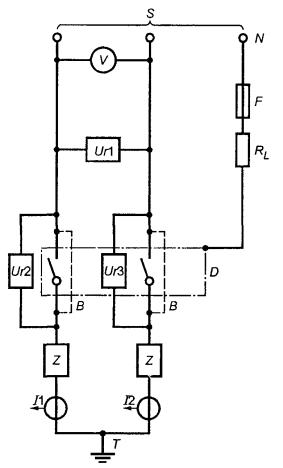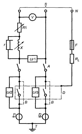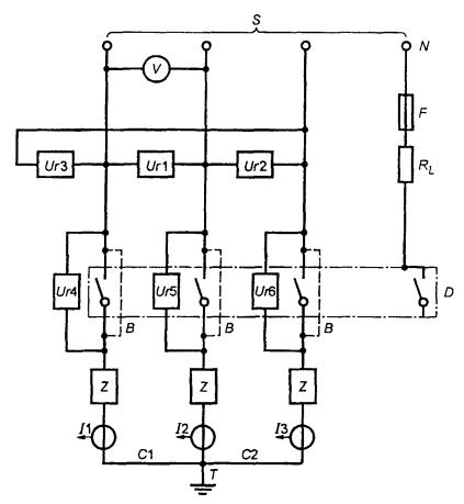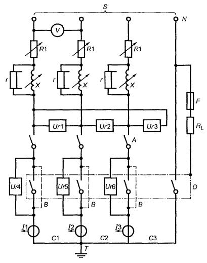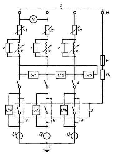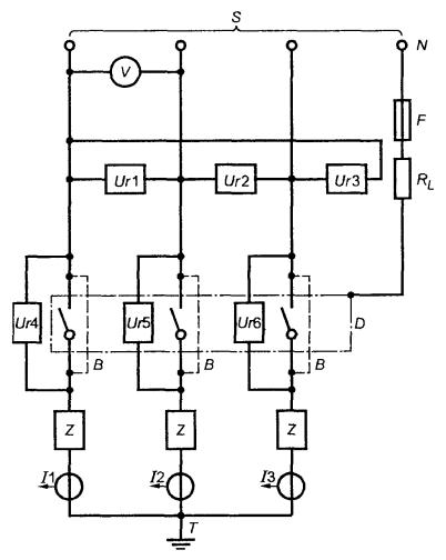 низковольтной стороны цепи питания, замыкающее устройство А располагается с низковольтной стороны. 2 Ur1, Ur2, Ur3 могут альтернативно присоединяться между фазой и