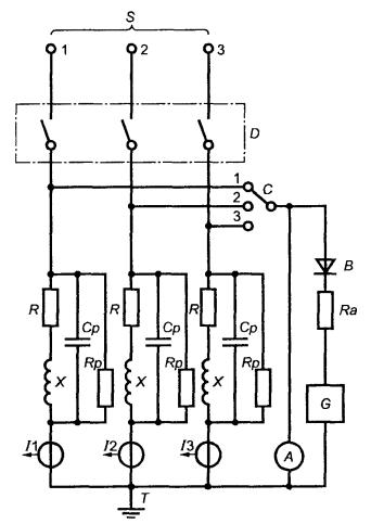 10 Z, где - переключающий диод с мгновенной блокировкой В; переключающие диоды обычно используемые в компьютерах, например кремниевые переключающие диоды с диффузным переходом с током не выше 1 А, подходят для этого. Из-за значения частоты генератора G цепь нагрузки является практически чисто индуктивной и в момент прохождения тока через нуль напряжение до включения в цепи нагрузки достигает пикового значения. Для того чтобы убедиться, что компоненты цепи нагрузки пригодны, необходимо проверить на экране, имеет ли кривая восстанавливающегося напряжения в своей начальной точке (точка А, рисунок C.1) практически горизонтальную касательную. Фактический коэффициент g - это соотношение U1/U2. U2 считывается с экрана, U1, считывается между ординатой точки А и ординатой линии развертки, когда генератор уже не питает цепь нагрузки (рисунок C.1). При наблюдении восстанавливающегося напряжения в цепи нагрузки без параллельного сопротивления резистора R или параллельного конденсатора С на экране можно определить собственную частоту колебаний цепи нагрузки. Следует предпринять меры предосторожности, чтобы входная емкость осциллографа или его соединительных проводников не влияла на резонансную частоту цепи нагрузки. Если эта собственная частота превышает верхний предел требуемой величины f, можно получить нужные значения частоты и коэффициента g, подсоединив параллельно конденсаторы С, и сопротивления Rp соответствующей величины. Сопротивления R практически не должны быть индуктивными. В качестве первого шага рекомендуется отрегулировать каждую фазу отдельно. Регулировку завершают последовательным соединением во всех возможных комбинациях генератора высокой частоты с одной фазой, подключаемой последовательно, и другими двумя, подключенными параллельно, как показано на рисунке 16; при необходимости осуществляют доводку для достижения в каждой комбинации заданных значений f и g. Примечания 1