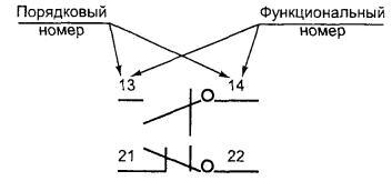 Функциональные номера 5 и 6 (для размыкающих контактов), 7 и 8 (для замыкающих контактов) присваивают выводам вспомогательных цепей, в которые входят вспомогательные контакты со специальными функциями Примеры: