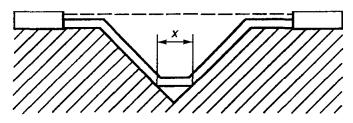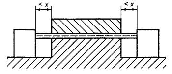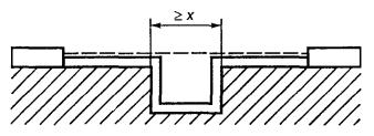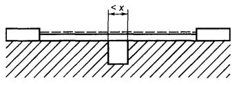 Условие: рассматриваемый путь утечки охватывает желобок с параллельными или сходящимися боковыми стенками любой глубины при ширине менее Х мм. Правило: расстояние утечки и воздушный зазор измеряют по прямой линии поверх желобка, как показано на схеме.