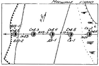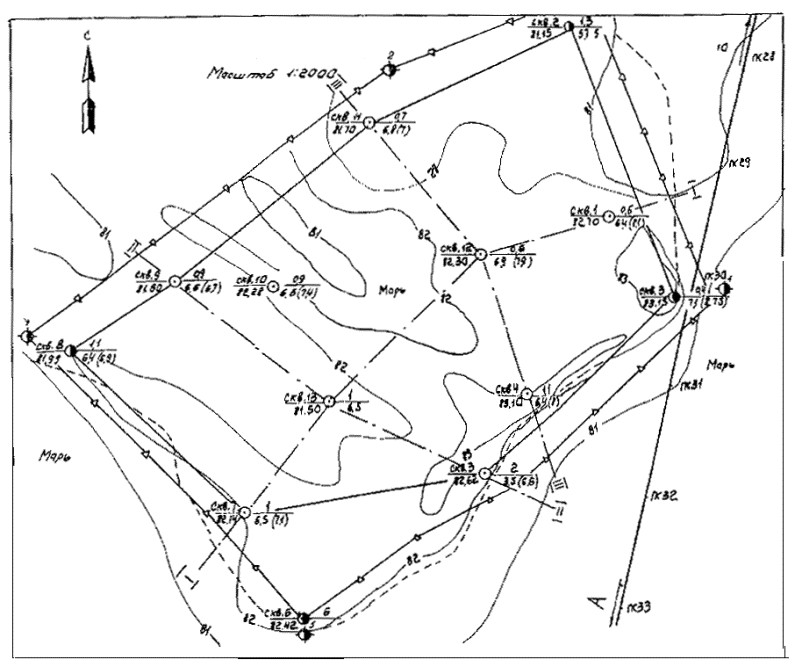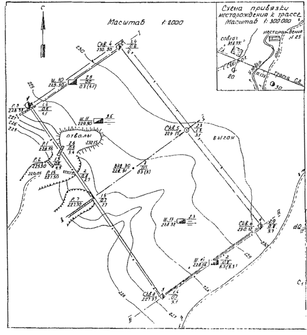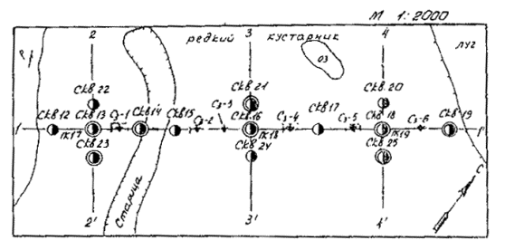 (проходка шурфов и буровых скважин, тип и марка станков, геофизические методы