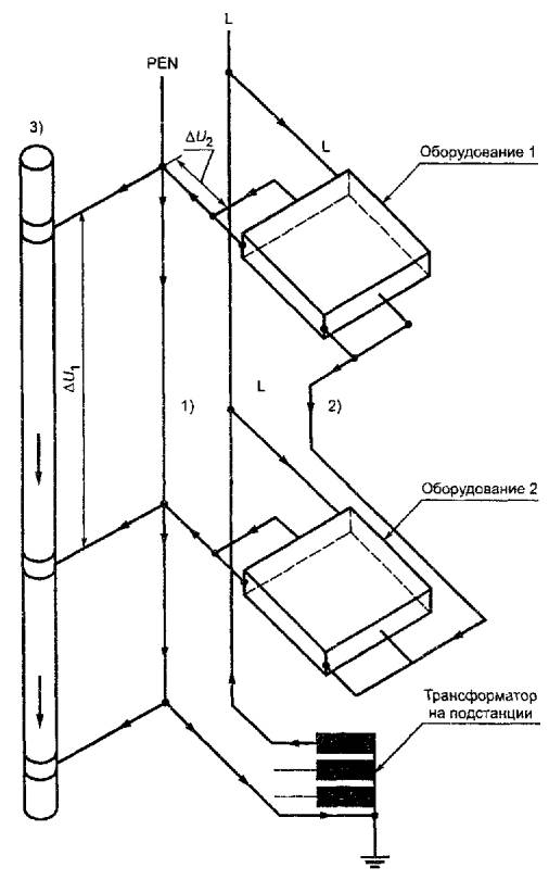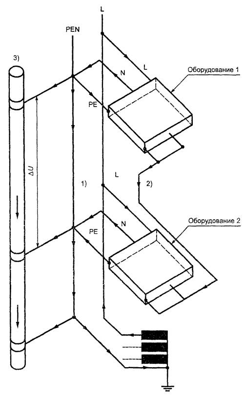 образованными питающими и сигнальными кабелями. 1) - PEN-проводник; 2) - уравнивание электрических потенциалов; 3) - металлоконструкция здания, например труба центрального отопления Рисунок 1а - TN-C-система