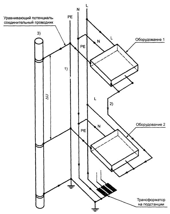 здания 1) - устранение падения напряжения ΔU вдоль РЕ; 2) - соединительный проводник на