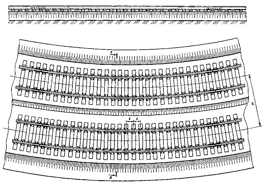 пути с деревянными шпалами в кривых участках: К - ширина колеи; М -