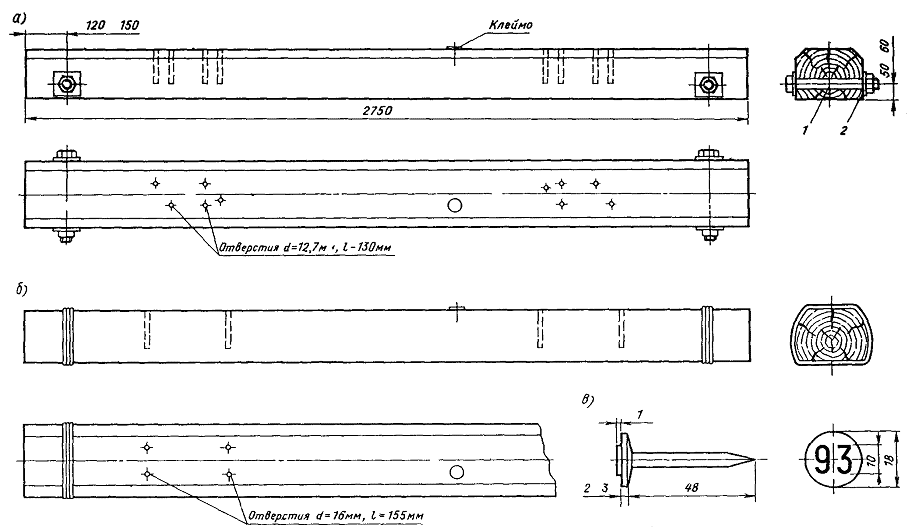 Черт. 144. Прокладка стыковая ПС-65 Черт. 145. Планка под болты ППБ-65 Черт. 146. Планка стопорная СИ-65 Черт. 147. Втулка В-27 Черт. 148. Болт 2М27´180 ГОСТ 11530-76 Черт. 149. Изолирующий стык рельсов типа Р50 с объемлющими накладками на деревянных шпалах Таблица 38. Детали, входящие в
