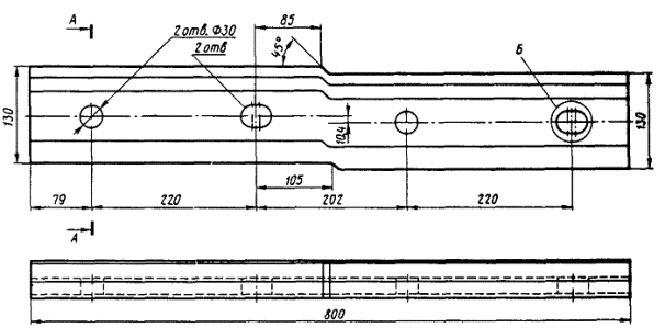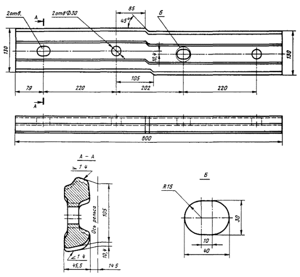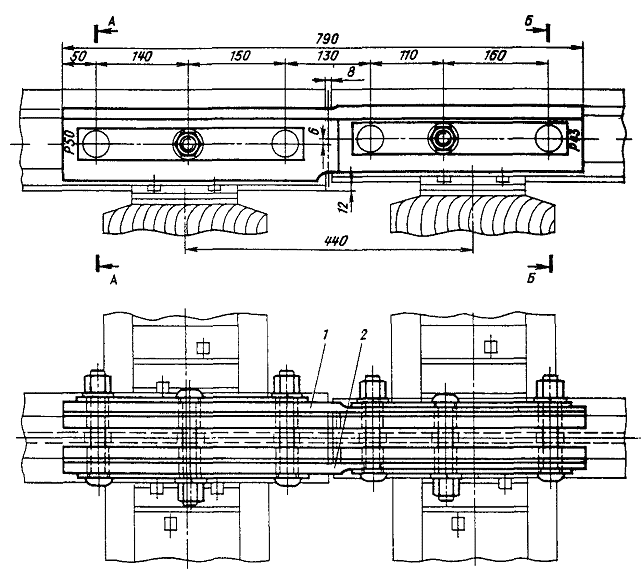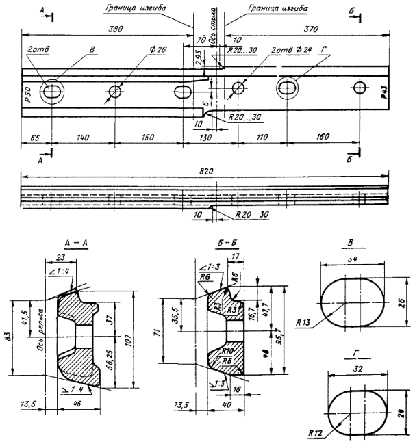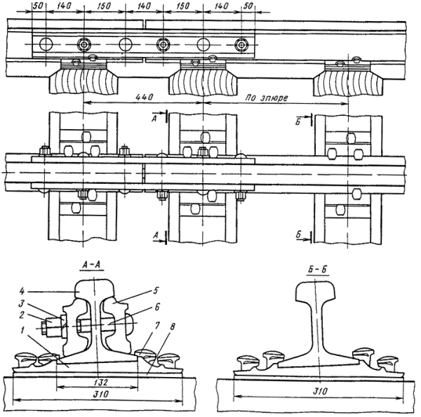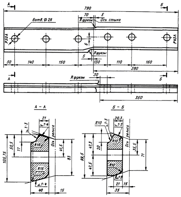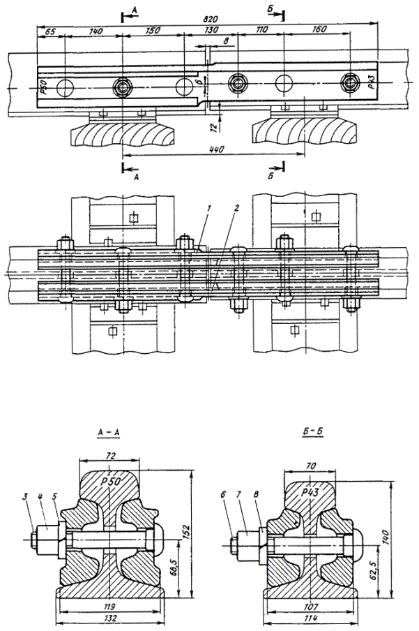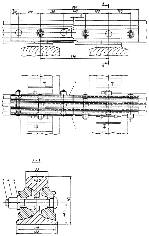 Черт. 130. Переходный стык рельсов Р50 - Р43 на переходных накладках из