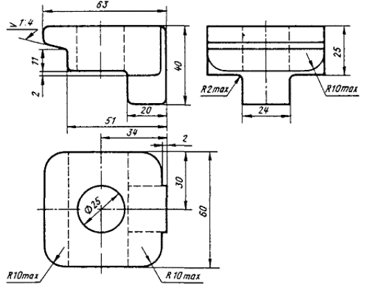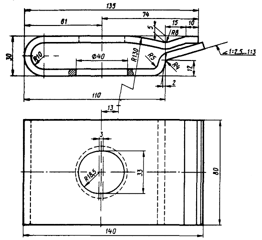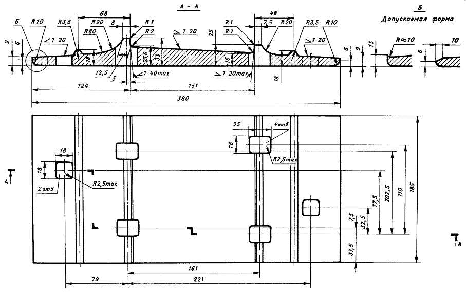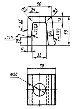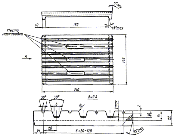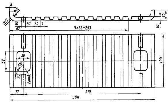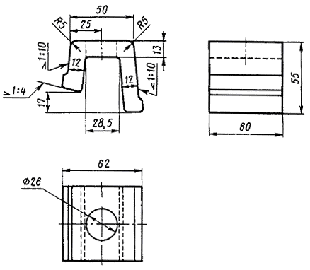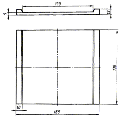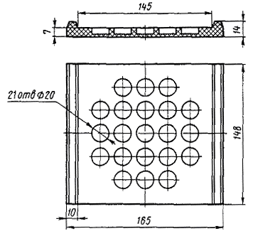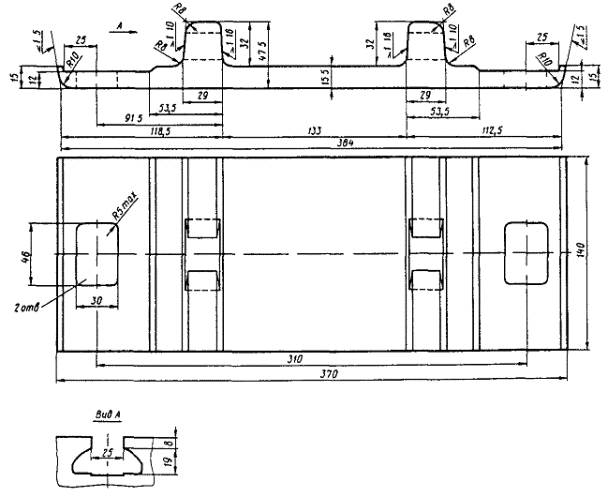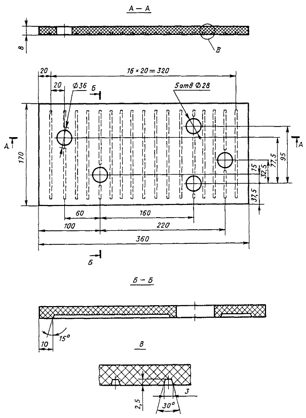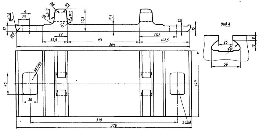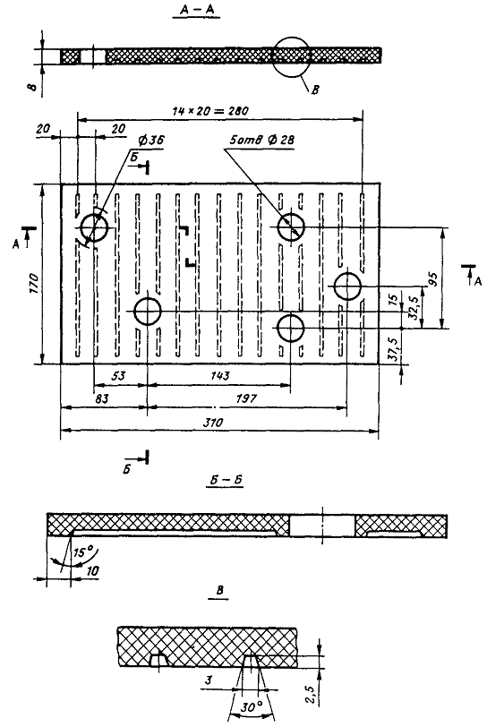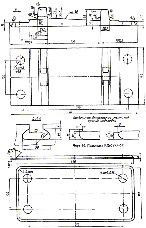Черт. 140. Накладка объемлющая НИ-65 Черт. 141. Прокладка боковая составная ПБС-65 Черт. 142. Прокладка нижняя ПН-65 Черт. 143. Подкладки ПИ-65, ПИ-50, ПИ-43 Таблица 37. Размеры подкладок ПИ