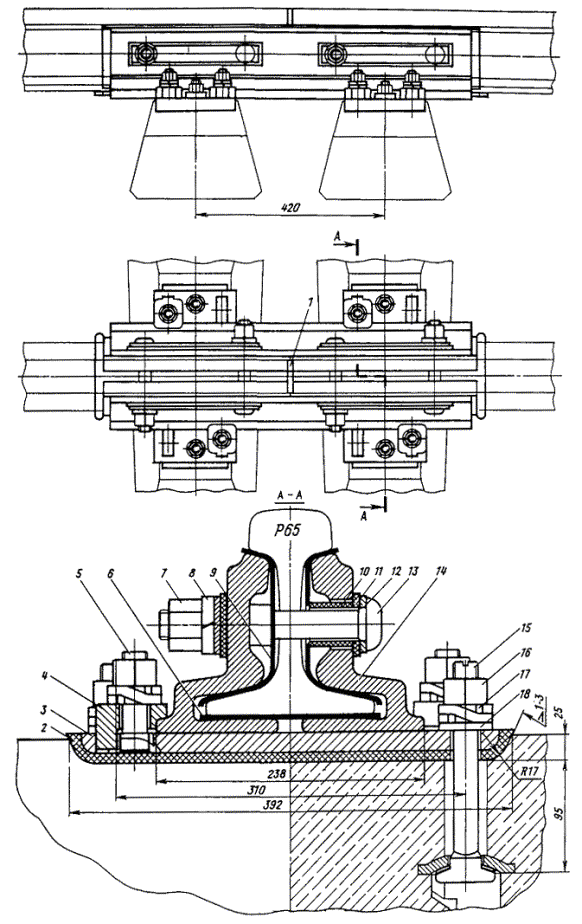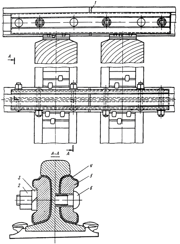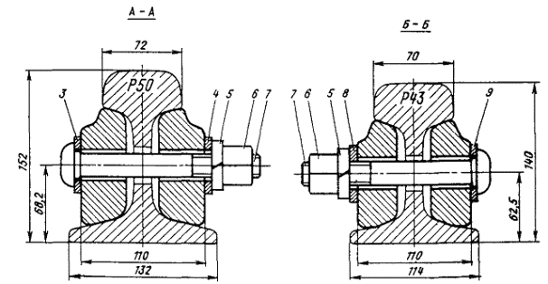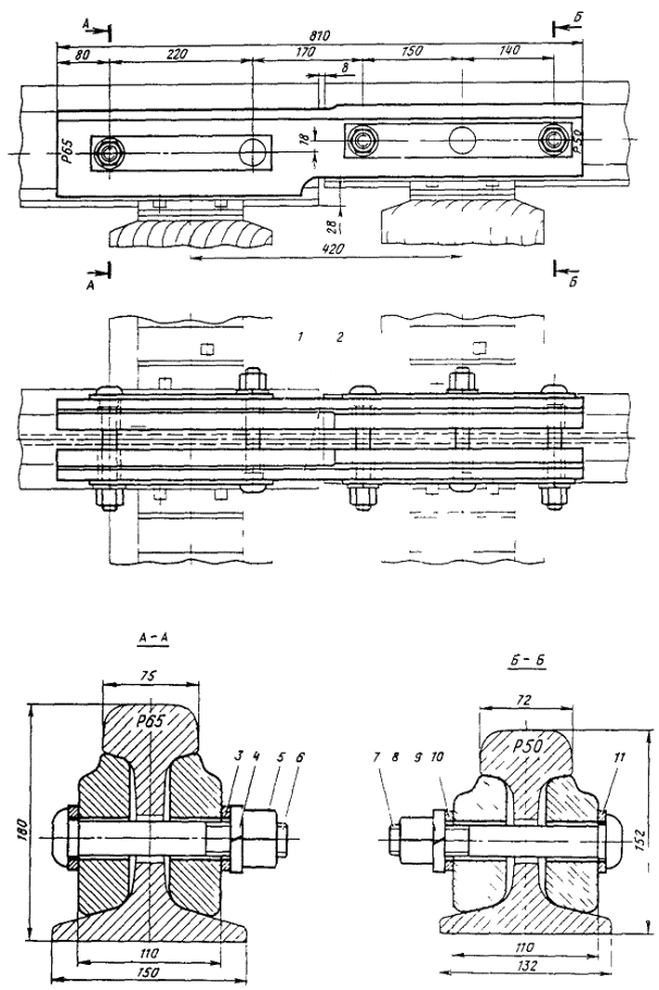 централизации (черт. 135 - 174, табл. 34 - 41). Черт. 135. Клееболтовой изолирующий стык рельсов типа Р65 с двухголовыми шестидырными накладками Таблица 34. Детали, входящие в