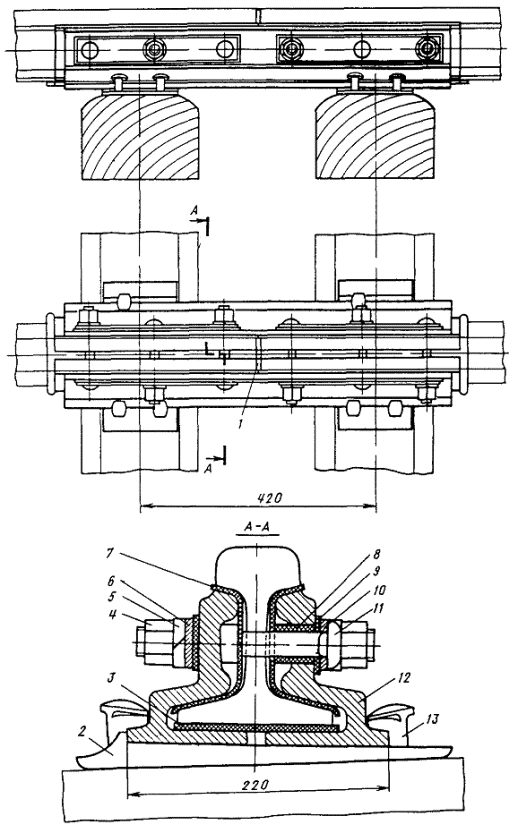 изолирующего стыка рельсов типа Р65 с объемлющими накладками на деревянных