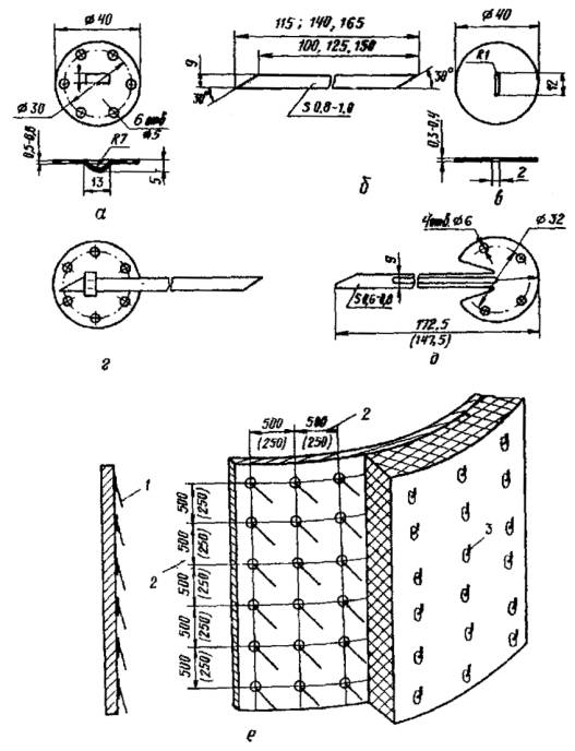 между ремонтами теплоизоляции. Рис. 1. Детали пластинчатых штырей, схем закрепления теплоизоляции: а - приклеиваемая часть штыря; б - штырь; в