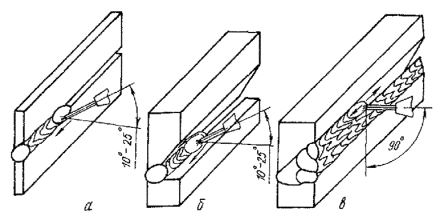 соединений представлена на рис. 13, а, б (сварку ведут углом назад). Угол между