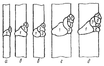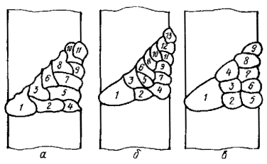 этом случае всю разделку заполняют толстыми слоями способом снизу-вверх (рис. 8, б). Рис. 8. Порядок наложения слоев стыкового