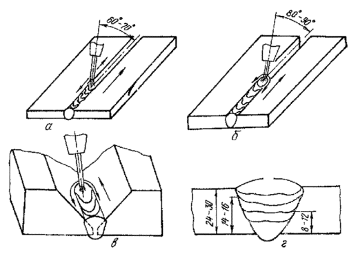 валик. Возможна также сварка углом вперед. Рис. 9. Техника наложения горизонтальных