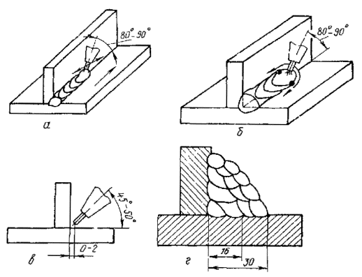 полкой таврового соединения и продольной осью проволоки составляет 45-50° (см. рис. 13, в). Швы катетом 3-4 мм накладывают при