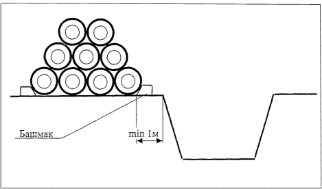 3.7. При складировании труб вблизи земляных выемок (траншеи, котлованы) расстояние от бровки выемки до места складирования должно определяться в зависимости от глубины траншеи и типа грунта (угла естественного откоса).
