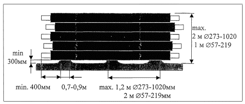 4. Складирование и хранение.4.1. Складирование и хранение изолированных труб на приобъектных складах и стройплощадках должно выполняться в штабелях на подготовленной и выровненной площадке, причем нижний ряд труб должен располагаться на песчаных подушках: высотой не менее 300 мм; шириной 0,7 - 0,9 м - для труб диаметром до 530 мм; 1 - 1,2 м - для труб диаметром 630 - 1020 мм; с шагом не более 5,0 м. 4.2. Высота штабеля изолированных труб должна быть не более 2 м. Должны быть предусмотрены меры против раскатывания труб. Различные виды изолированных изделий и деталей должны храниться отдельно.