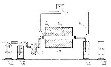 6 - фарфоровая трубка; 7 - милливольтметр; 8 - бюретка; 9