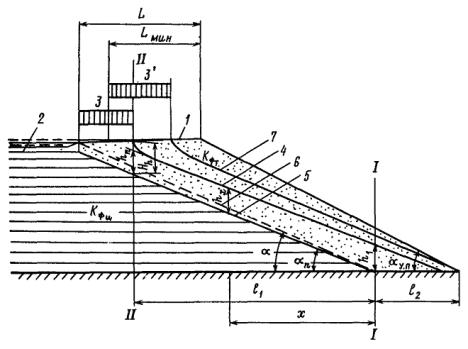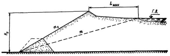 низового откоса дамбы Lмин, близко подходит к поверхности низового откоса при ширине пляжной