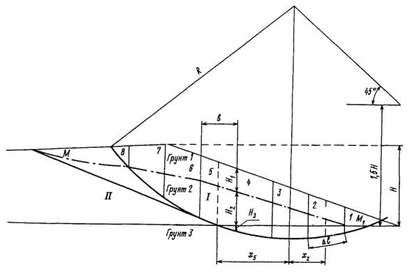 показана на рисунке. Грунт 1 - верхний слой намытого грунта выше депрессионной кривой MM1: объемная масса практически сухого грунта g1 = 1,6 г/см3; угол внутреннего трения j1 = 30°; удельное сцепление С1 = 0,07 кгс/см2. Грунт 2 - нижний слой намытого грунта ниже депрессионной кривой MM1: объемная масса взвешенного в воде грунта объемная масса грунта, насыщенного водой угол внутреннего трения j2 = 26°; удельное сцепление С2 = 0,04 кгс/см2. Грунт 3 - грунт основания гидроотвала: объемная масса взвешенного в воде грунта объемная масса грунта, насыщенного водой, угол внутреннего трения j3 = 20°; удельное сцепление С3 = 0,11 кгс/ см2. Схема расчета устойчивости откоса I - упорная призма; II - промежуточная зона; 1-8 - номера «столбиков»