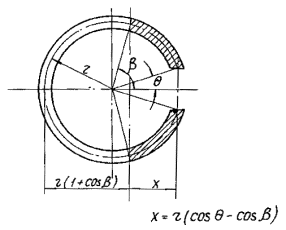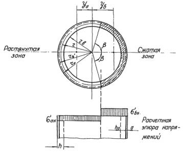 горизонтального сечения трубы и эпюра напряжений ПРИНЯТЫЕ ОБОЗНАЧЕНИЯ yа - расстояние от центра трубы до центра тяжести растянутой зоны. yб - расстояние от центра трубы до центра тяжести сжатой зоны rв - внутренний радиус сечения. rа - радиус арматуры. rн - наружный радиус сечения. r - расчетный радиус,