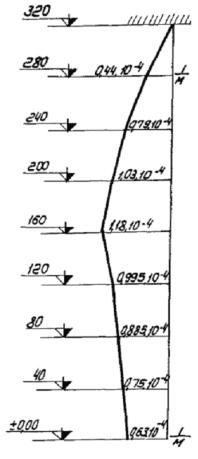 суммарного изгибающего момента Рис. 7. Эпюра кривизны оси ствола трубы (3-е приближение) Таблица 14
