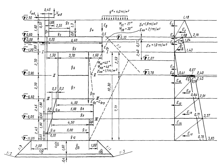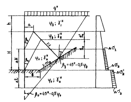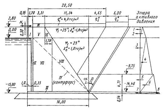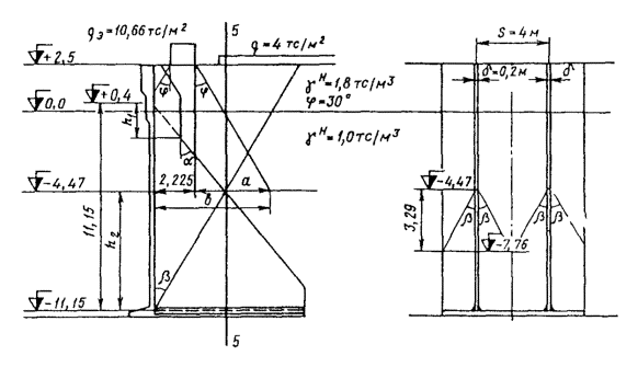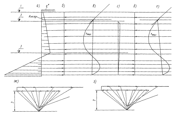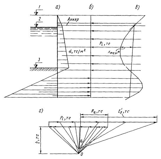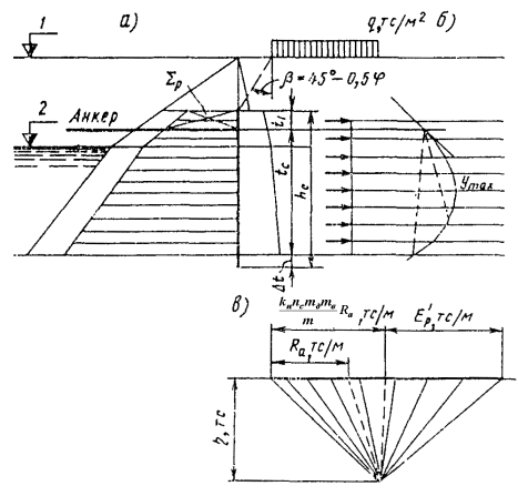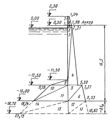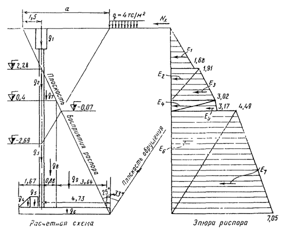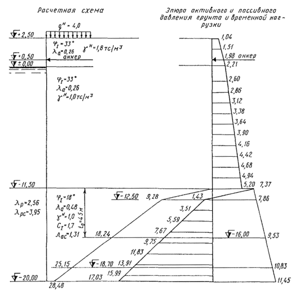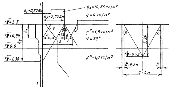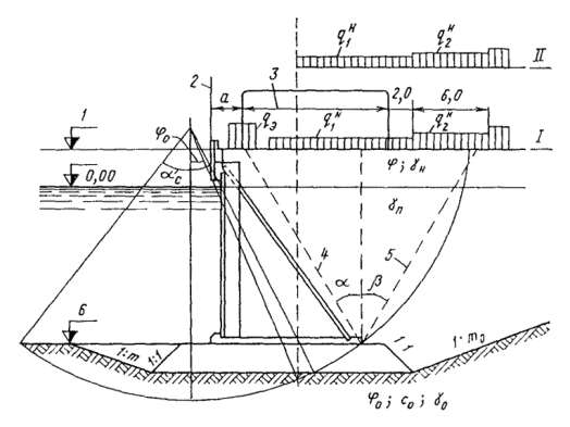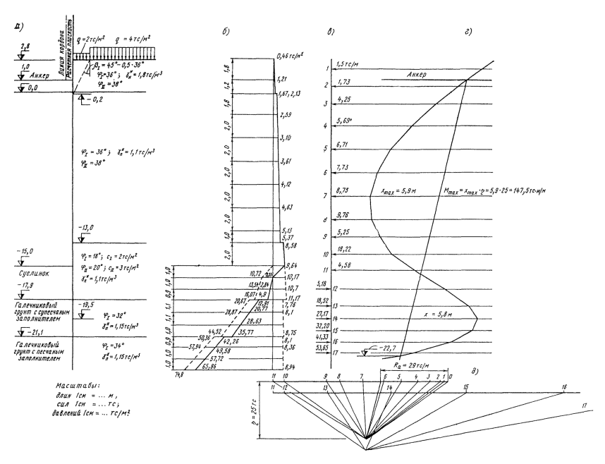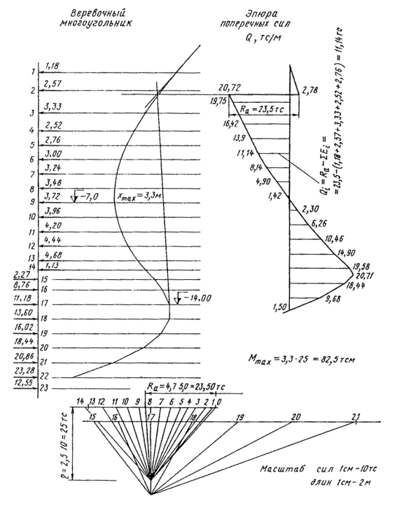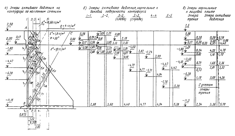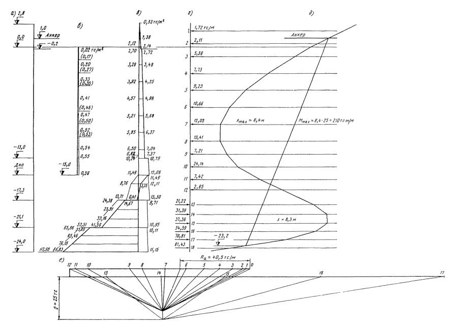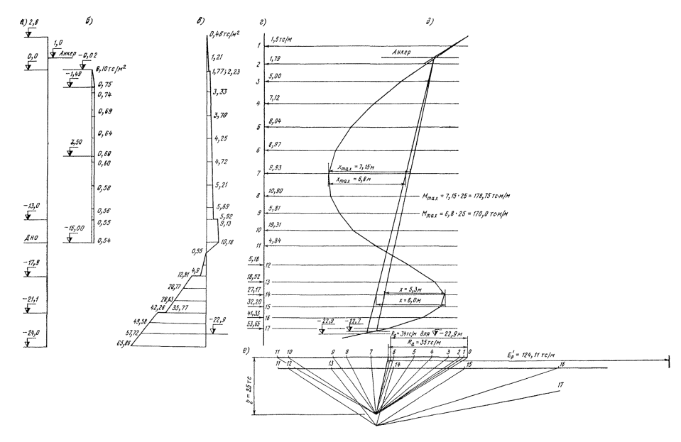 Рис. 5. Графоаналитический расчет лицевой стенки больверка по второй группе предельных состояний