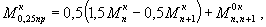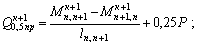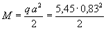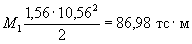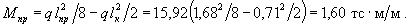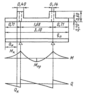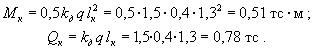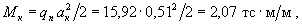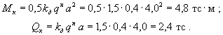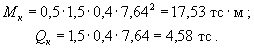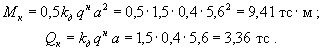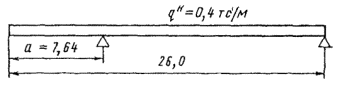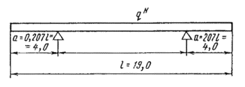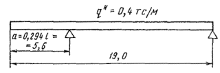 Рис. 10. Схема для расчета сваи на подъем за две точки со стенда. Расчет прочности сваи во время строительства. Подъем сваи со стенда производим за две точки при достижении бетоном 70 %-ной прочности. Расчетная схема для подъема сваи, работающей на сжимающую нагрузку, представлена на рис, 10. Равномерно распределенная нагрузка от собственного веса сваи qн = 0,4×0,4 · 2,5 = 0,4 тс/м. Изгибающий момент на консоли и поперечная сила определяются с учетом коэффициента динамичности kд = 1,5 (см. п. 4.7 СНиП II-17-77):