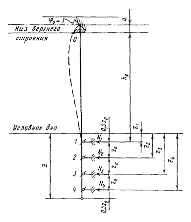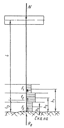 (Измененная редакция). Определение глубины погружения свай. Расчет глубины погружения свай производится по главе СНиП II-17-77. Глубина погружения определяется несущей способностью висячей сваи. Рис. 7. Расчетная схема для определения не сущей способности сваи, работающей на сжимающую нагрузку. Для свай, работающих на сжимающую нагрузку, расчет производится по формуле