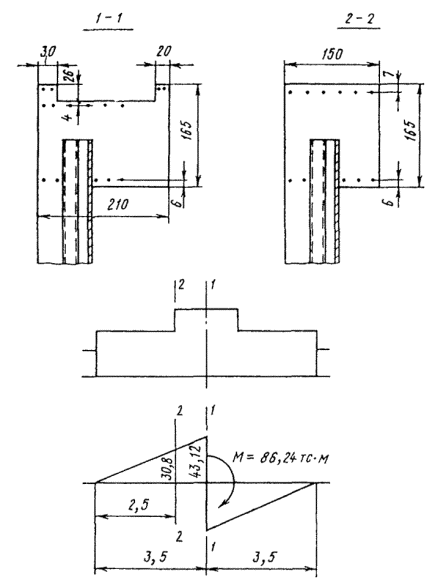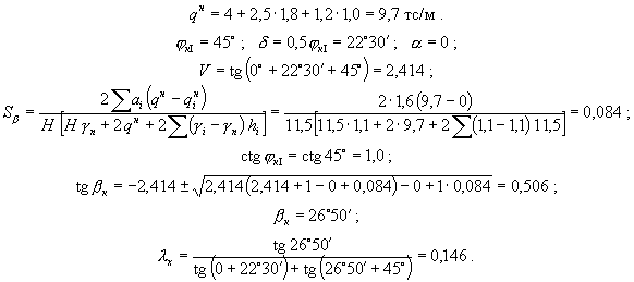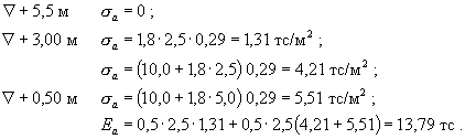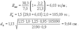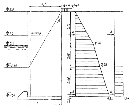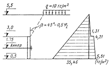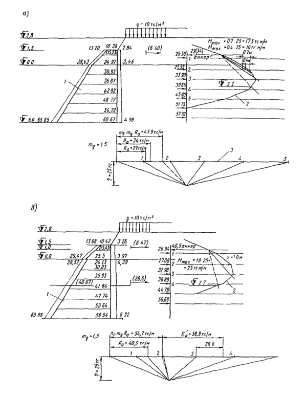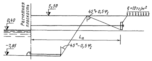 Ra = 23,5 тс/м - по рис. 5; Еa = 20000000 тс/м2 - модуль упругости стали; La = 18,0 + 1,0 = 19,0 м - длина анкера (рис. 6); Fa = 0,0044 м2 - площадь сечения анкера; Mp = 151,40 тс·м/м - изгибающий момент (значение определено в начале разд. 6 настоящего расчета).