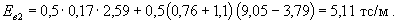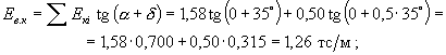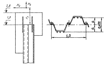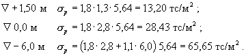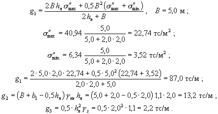 Расчетные значения усилий в одной свае-оболочке с учетом перезаглубления стенки по расчету ее устойчивости на поворот вокруг точки крепления анкера определяются с учетом коэффициентов, полученных в расчете по первой группе предельных состояний: MII = 82,5 · 0,85 (1,6 + 0,1) 1,27 = 151,40 тс·м/м; QII = 20,72 (1,6 + 0,1) 1,15 = 40,50 тс. Продольная сила от веса надстройки и веса части сваи принимается из расчета по первому предельному состоянию (см. разд. 3 настоящего расчета). Сила трения от активного давления грунта до Ñ - 7,0 м