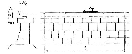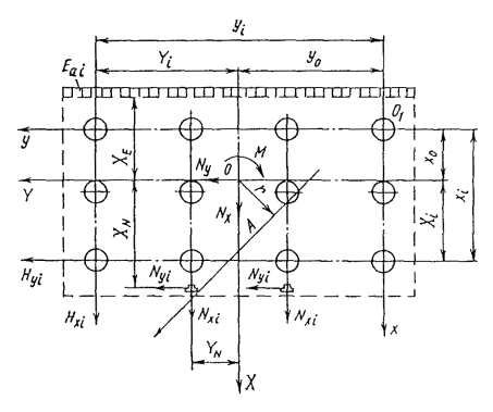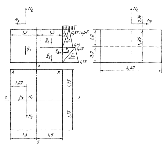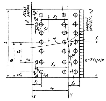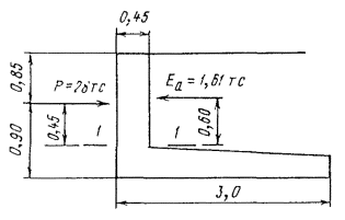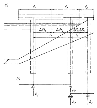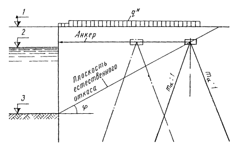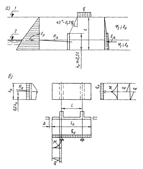 или 1,1Pн · 12,0 = 0,75 · 151,40; Pн = 8,60 тс. Принимаем для предварительного натяжения анкеров усилие Pн = 8,16 тс (меньшее из полученных значений). 8. РАСЧЕТ АНКЕРНОЙ ОПОРЫ Принята козловая опора из призматических железобетонных свай сечением 40×40 см, забитых в грунт с наклоном 3 : 1. Головы свай заделаны в шапочную железобетонную балку. Расстояние опоры от лицевой стенки определено расположением ее за линией откоса, проведенной под углом внутреннего трения грунта засыпки jI от пересечения плоскостей дна и лицевой стенки больверка (см. пунктирную линию на рис. 6). Рис. 6. Схема к расчету козловой анкерной опоры Расчет устойчивости и прочности опоры производится по первой группе предельных состояний. Расчетными нагрузками на опору являются анкерное усилие и вес грунта и- временных нагрузок, лежащих на шапочной балке. Козловые опоры поставлены с шагом анкерных тяг. С этой длины собираются нагрузки. Вес грунта, лежащего на балке,