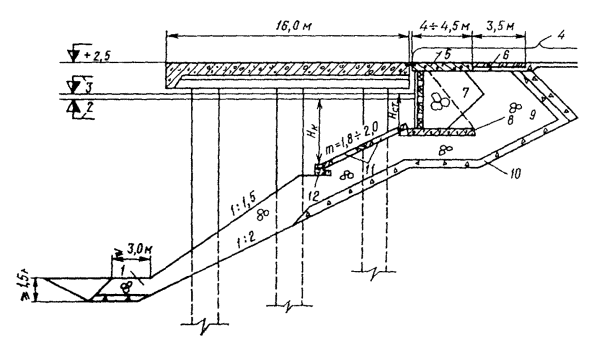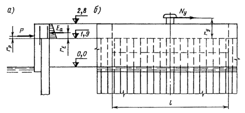 исследований. 1.2. Порядок выдачи заданий на проектирование, стадийность, объем, содержание и оформление проектной документации должны соответствовать указаниям СН 202-81 «Инструкция о составе, порядке разработки, согласования и утверждения проектов и смет на строительство предприятий, зданий и сооружений», СН 219-70 «Инструкция по разработке проектов и смет для строительства за границей при техническом содействии СССР». 1.3 (1.3). При разработке проекта причального сооружения необходимо иметь исходные данные, устанавливаемые в соответствии с генеральным планом и технологической частью проекта, естественными условиями участка строительства, а также с условиями производства работ [согласно пп. 1.4 (1.4) - 1.6 (1.6) настоящего Руководства]. Технологическая часть проекта определяет следующие исходные данные проекта причального сооружения: длину причалов; отметку дна у причала; отметку кордона; категорию эксплуатационных нагрузок; типы расчетных судов; специальные требования к причалу. 1.5 (1.5). В качестве исходных используются следующие данные о естественных условиях и застройке участка строительства: а) топографические (план участка строительства с горизонталями и привязкой существующих зданий и сооружений); б) гидрографические (план промеров глубин акватории с построением изобат, сведения о морских свалках грунта); в) гидрологические и метеорологические (режимные характеристики ветра; волнения и уровней моря, сведения о ледовом режиме, заносимости или размыве в месте расположения проектируемого сооружения, степень агрессивности среды, климатические данные); г) биологические, характеризующие отсутствие или наличие древоточцев различных видов, степень интенсивности их деятельности, сохранность и гниение древесины на различных уровнях, наличие биологических объектов, подлежащих охране; д) геологические и гидрогеологические (геологические профили, физико-механические характеристики грунтов основания и засыпки, сведения о грунтовых водах и их агрессивности); е) данные о сейсмичности (с учетом микрорайонирования), а также карстовых, оползневых и просадочных явлениях на участке строительства. 1.6 (1.6). Данные об условиях производства работ должны включать следующие сведения: а) производственные возможности строительной организации (производственные базы, их расположение и характеристика, краны и иное строительное оборудование); б) размещение предприятий, изготовляющих сборные железобетонные элементы, их производственная мощность, степень загрузки, технологические возможности; в) транспортные связи района строительства с базами, заводами-поставщиками, пунктами заготовки местных строительных материалов; г) местные строительные материалы (номенклатура, количественная и качественная характеристики, условия разработки и транспортировки). 2 (2с). КЛАССИФИКАЦИЯ ПРИЧАЛЬНЫХ СООРУЖЕНИЙ2.1 (2.1с). Морские причальные сооружения подразделяются на постоянные и временные. Постоянные сооружения предназначены для длительной эксплуатации. К временным относятся сооружения, используемые в период строительства или ремонта постоянных сооружений. 2.2. Причальные сооружения подразделяются в зависимости от: а) расположения по отношению к берегу - на набережные, пирсы (узкие и широкие), рейдовые (островные и плавучие) и выдвинутые в акваторию и связа