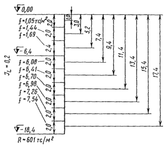 где nc, n - то же, что в разд. 1 настоящего расчета; mд = 1,0 - по ВСН 3-80 и настоящему Руководству; kн = l,4 - по СНиП II-17-77, когда несущая способность свай определена расчетом; m = 1,0 - по СНиП II-17-77; mR = mf = 1,0 - по СНиП II-17-77 при погружении свай забивкой; F = 0,4 · 0,4 = 0,16 м2 - площадь поперечного сечения сваи; u = 4 · 0,4 = 1,6 м - периметр поперечного сечения сваи. (Измененная редакция). Основываясь на предположении, что к моменту эксплуатации закончатся основные осадки насыпного песчаного грунта, а также учитывая, что погружение свай ведется через насыпной грунт, принимаем, что в нем будут реализовываться силы трения по боковой поверхности свай в размере 0,3 от расчетного сопротивления f для данной категории грунта, т.е. для крупнозернистого песчаного грунта. Расчетные сопротивления суглинка определены в соответствии с его показателем консистенции IL = 0,2. Расчленение пластов грунта на однородные слои приведено на рис. 7. За отсчетный уровень принимается расчетный уровень воды на Ñ 0,0. Принимаем погружение сваи до Ñ - 18,4 м: