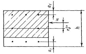 при наличии случайного эксцентриситета. Эксцентриситет Проверка прочности производится по указаниям п. 3.65 Руководства по проектированию бетонных и железобетонных конструкции из тяжелого бетона (без предварительного напряжения) для прямоугольных сечений с арматурой равномерно распределенной по линиям центров тяжести стержней (рис. 9). Условие, по которому проверяется прочность сечения, принимается в зависимости от относительной высоты сжатой зоны: