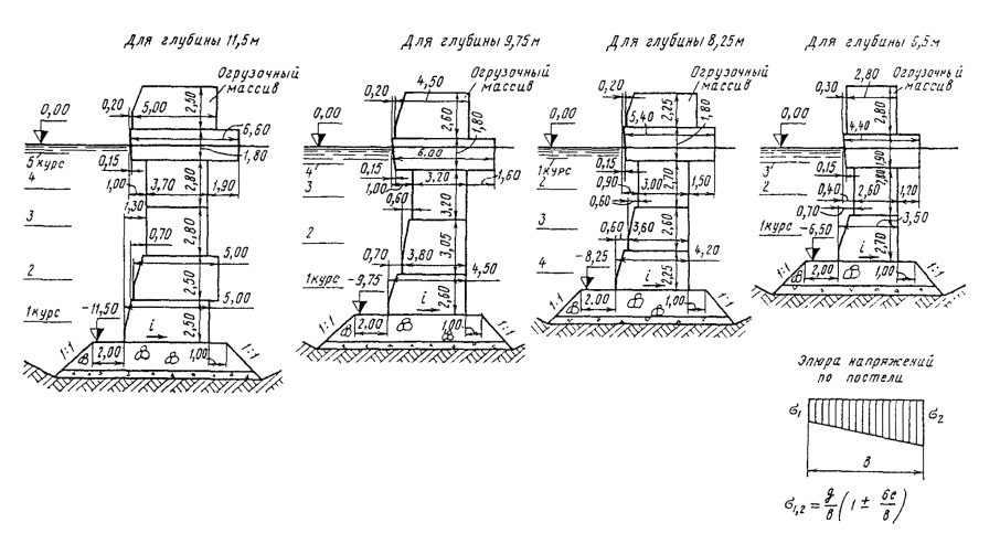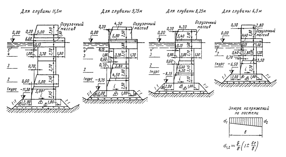 редакция). 3.4. При определении набора вариантов конструкций, подлежащих рассмотрению в техническом проекте, следует исходить из условий, указанных в пп. 1.3 (1.3) - 1.6 (1.6) при выполнении требований пп. 3.1 (2.1) - 3.3 (2.3) настоящего Руководства. Рекомендуется также учитывать следующие условия: а) при проектировании конструкций из железобетона прежде всего следует рассмотреть в качестве варианта конструкцию из сборного железобетона, за исключением сооружений, для которых нецелесообразность этого решения доказана предшествующим проектированием; б) вариант набережной стенки из обыкновенной массивовой кладки следует включать в проект при рассмотрении гравитационные конструкций, возводимых на плотных малосжимаемых основаниях и при наличии в районе строительства карьеров камня. При этом надо учитывать, что суммарный вес сборных элементов, входящих в состав набережной стенки из массивовой кладки, обычно относительно высок, что соответственно увеличивает стоимость перевозки массивов от пункта изготовления к месту строительства и приводит к необходимости использования, как правило, построечных полигонов, а не заводов изготовления массивов; в) вариант причального сооружения из пустотелых бетонных массивов необходимо включать в проект при рассмотрении гравитационных конструкций. Следует учитывать весьма высокие технико-экономические показатели по стоимостным показателям и строительным материалам (цемент, камень, щебень, бетон и др.) по сравнению с курсовой кладкой из обыкновенных бетонных массивов, а также возможность возведения кладки из пустотелых бетонных массивов на грунтах средней плотности с выдерживанием необходимых коэффициентов безопасности сооружения; г) вариант конструкции из массивов-гигантов следует включать в проект глубоководных причалов при наличии объема строительства, экономически оправдывающего устройство специальной базы. При этом необходимо рассматривать возможность транспортирования массивов-гигантов на плаву на значительные расстояния при условии экономической целесообразности сооружения этих конструкций на централизованной базе для нескольких отдельных объектов строительства. В проекте рекомендуется, кроме изготовления массива-гиганта целиком на берегу, рассматривать также (с учетом местных гидрологических и метеорологических условий) возможность сооружения на берегу лишь нижней части конструкции с последующей достройкой ее на плаву до проектной высоты; д) вариант конструкции причального сооружения из железобетонных тонкостенных цилиндрических оболочек большого диаметра надлежит включать в проект при строительстве глубоководных сооружений с глубиной Н ³ 11,5 м, когда технико-экономические показатели по другим сравниваемый вариантам гравитационных причальных сооружений (уголковых, массивовых и др.) существенно ниже показателей рассматриваемого варианта; е) при проектировании больверков следует рассматривать вариант с лицевой стенкой из стального шпунта; ж) вариант стальных опор, а также верхних строений рекомендуется рассматривать в проекте глубоководных эстакад и конструкций мостового типа, если он способствует созданию благоприятных условий производства работ, уменьшению сроков строительства и экономии средств. Этот вариант следует включать в проект также в случаях, 