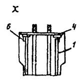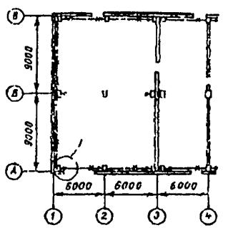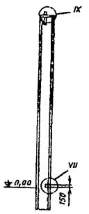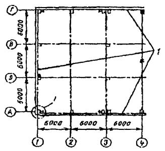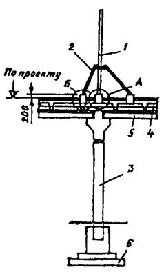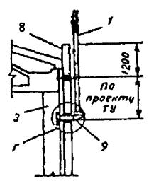 Примечания: 1. Обозначения: 1 - молниеприемник; 2 - оттяжка; 3 - колонна, арматура которой используется в качестве токоотвода; 4 - плиты перекрытия; 5 - ригели; 6 - фундамент - заземлитель; 7 - стропильная стальная конструкция; 8 - стеновая панель; 9 - опорный столик. 2. Узлы А - Г показаны соответственно на рис. 20 - 23. Рис. 23. Установка