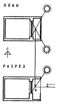 светопроема и расчетную точку «В» помещения в плане (рис. 5); на генплане участка