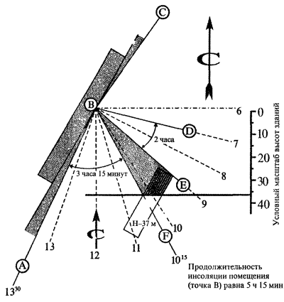 инсоляционного графика совмещают с расчетной точкой «В» помещения; инсоляционный график